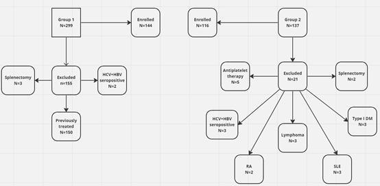 This was a single centre study which included 144 naive HCV related HCC adult patients (group1) &116 HCV related cirrhotic adult patients (group 2) who attended the early detection of HCC clinic at Specialized Medical Hospital (SMH), Mansoura University, Egypt. Patients with history of other malignancies (3 cases in group 2); patients with history of autoimmune disorders such as systemic lupus erythematosus (SLE) (2 cases in group 2); rheumatoid arthritis (RA) (3 cases in group 2); type 1 diabetes mellitus (DM) (3 cases in group 2); patients who had positive ELISA test for both HCV& HBV (2 cases in group1, 3 cases in group 2); patients on anti-platelet drugs (5 patients in group 2); patients who had undergone splenectomy (3 cases in group 1& 2 cases in group 2); patients who received HCC related treatments (150 cases in group 1), were exclude (Figure 1).