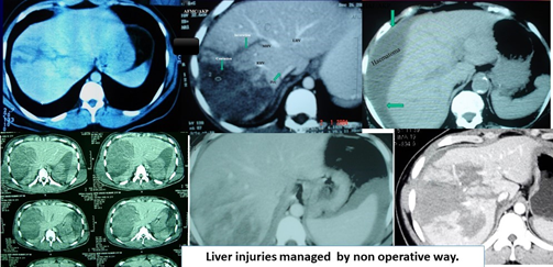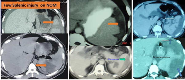 Blunt injury of abdomen due to road traffic accident is very common and involve young people. All organs are at risk of injury, but liver and spleen are commonly involved.8,9 Liver was the commonest organ (37.5 %) injured followed by spleen (30.5%) It is potentially life-threatening in 15-25%.10 The present series has a mortality of 3/72 (4.16 %). It looks lower possibly due to low magnitude of injury due to slower speed due to under developed road and priority IV patients were not brought to hospital. Non- Operative Management (NOM) is established as the modality of choice in haemodynamically stable or made stable after resuscitation.10,11 We managed 57% of our patients NOM way, where mortality is lower than operative method. Now a days NOM is seen effective even in penetrating abdominal injury with haemodynamically stable with no peritonitis on a Cochrane meta-analysis involving over 100s of patients.12,13 The success rate was found to be 96.7% in patients with mixed liver and spleen injury in a study with 731 patients.14 Present study has similar data in separate liver 21/27 (88.8%) and spleen 63.63% Table 2 and over all NOM success in > 55% of patients. In a meta-analysis, it was noted that one-fourth of the blunt abdominal trauma accounted for Splenic injury.15 We have got 30.3% spleen injury (Figure 1). 14/22=63.63%, were NOM. Figure 2 & 3, which is comparable with the previous data,14 however it is reported that, high grade injury can lead to failure and prolonged hospitalization.15. Around 1/3rd (28-33%) need emergency laparotomy amongst the patient slotted for NOM in spite of adequate fluid resuscitation.2,16,17 The present study, rate of emergency surgery is almost the same (27.7%). Many considered Operating a patient on nonoperating group as a failure of NOM. Possibly this concept is wrong. How can one fail, when you save human life by operating them? Actually, it shows the wisdom of the team. The factors determine the outcome of NOM depends on the age, trauma score, number of organs injured, possibly the bleeding surface area. The fatality depends on the delay in emergency laparotomy and advanced age.17,18 So, the success of operating management in NOM patients going for surgery and primary operating management depends on the perfect timing of surgery. Young people tolerate delay better then elderly, single organ better than multiple and small surface of bleed than larger.16,17,18. There were 20 of 72(27.7%) patient, who required operative management, without thinking of failure but to save life. One should take pride on saving patients then fearing of failure in NOM injured spleen Figure 5, and doing relaparotomy, Right hepatectomy for haemostasis in injury of liver (Figure 4). Around 1/3rd needed (28-33%) emergency laparotomy amongst the patient slotted for NOM in spite of adequate fluid resuscitation.18 The Success of NOM is dependants on the age, trauma severity, number of organs injured possibly the bleeding surface area. The fatality depends on the delay in emergency laparotomy and higher age.16,17 We, prefer to abundant NOM in high grade injury patients going to haemodynamic state of un-stability and operated them early to save them. Possibly, due to timely change of operative management from NOM the mortality became less (4.16%). In fact, one young patient survived after debridmental resection of right liver with right lung contusion and became a doctor and one young soldier on bleeding splenic even after 72 hrs injury Figure 5& 6 survived.