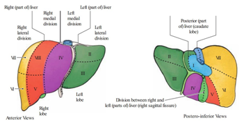 Anatomically, human liver have two lobes: a large right and a smaller left lobe, separated from each other on the diaphragmatic surface by the crescent ligament, and on the visceral surface in front - by the groove of the round ligament of the liver, and behind the venous ligament24 the liver has 2 more lobes: square and caudate. The square lobe is bounded by the slit of the round ligament on the left; the fossa of the gallbladder on the right, behind it is limited by the gate of the liver. The caudate lobe is bounded by a slit of the venous ligament on the left, the groove of the inferior vena cava on the right, and the gate of the liver in front. The thickness of the liver decreases towards the left lobe.25