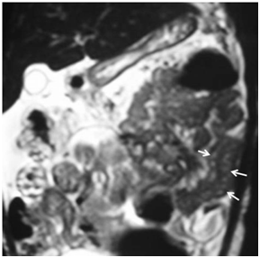 Figure 1 Coronal HASTE MR image shows ascites and diffuse thickening of the small bowel loops. There are multiple tubular and hyperintense channels in the jejunal wall (arrows).