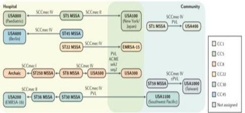 Figure 1 Most frequent MRSA clones. Sequence types (STs) of methicillin-sensitive Staphylococcus aureus (MSSA) are grouped into clonal complexes (CCs) by their similarity to a founder allelic profile (genotype)226. STs have different molecular properties that enable monitoring of the geographical spread of different clones. STs of MSSA can evolve into MRSA by acquiring staphylococcal cassette chromosome mec (SCCmec), of which there are different types (represented by roman numerals). Commonly used clone names are within parentheses. Numbers in the names of MRSA USA clones are ased on pulsed- field gel electrophoresis analysis.