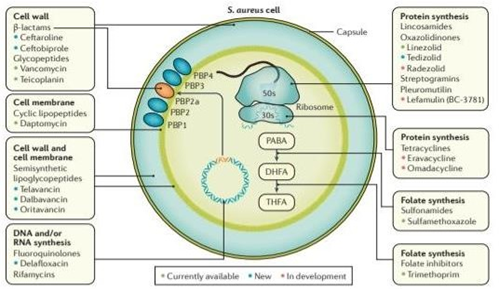 Figure 3 Bacterial targets of antibiotics active against MRSA. Antibiotics have diverse mechanisms of action and target different bacterial structures or metabolic pathways. Existing antibiotic options are in green, new antibiotics approved and on the market are in blue and antibiotics in the pipeline are in orange.