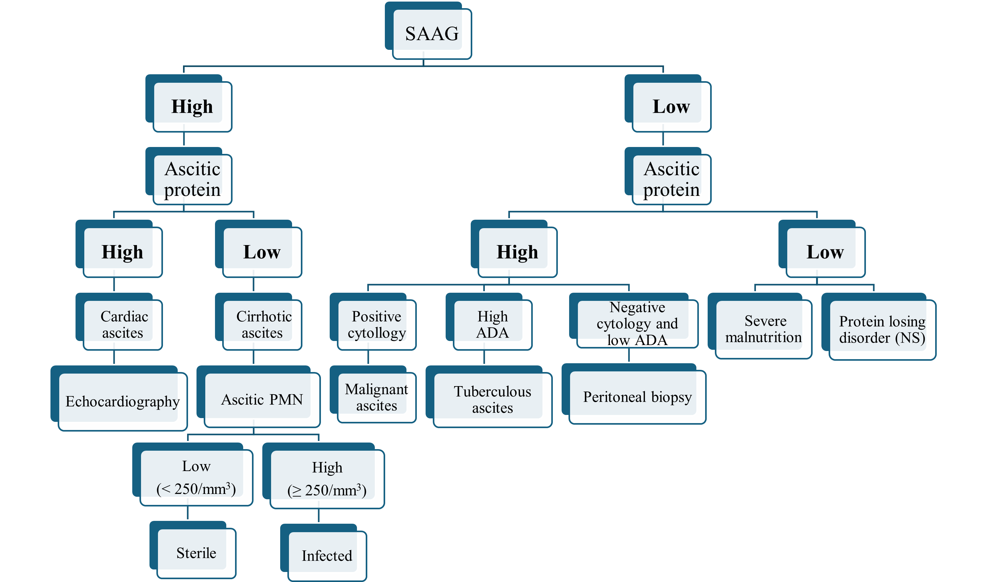 Based on these data, a simplified diagnostic algorithm is suggested (Figure 1). This figure shows that starting with SAAG, ascites can be divided into high vs. low SAAG. Each of these groups can be further divided into high vs. low ascitic protein. The next test will depend on the results of these two initial tests.