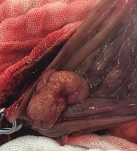 Figure 3 Sessile polyp incidentally found during colostomy formation. Taken 12/18/21 with permission of the patient in the archives of Alejandro Weber MD.
