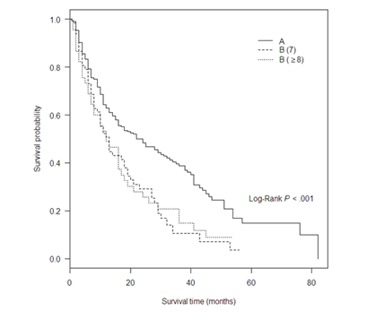 The study’s primary outcome was overall survival in each group. As expected, Child A group, which was the only group to be proved suitable and recommended for TACE, had the best survival. According to the survival curve that compares Child A, B(7), and B (≥8), the log rank test showed statistical difference among the 3 groups. Surprisingly, the survival curve of B (7) and B (≥8) are almost the same. After we explored the log rank test between B (7) and B (≥8), survival did not differ.