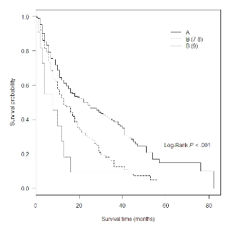 When we re-stratified the patients into Child A, Child B (7–8) and Child B (9), a statistical difference in overall survival was found with the worst survival in Child B (9) (P<.001) as shown in Figure 2. The median survival time was 22months in Child A, 13months in Child B (7–8), and 8months in Child B (9). The 1 and 2year survival rates for Child B (7–8) were 52 and 30%, respectively, while the 1-year survival rate for Child (9) was 27%. In a comparison between Child B (7–8) and Child B (9), overall survival did not reach statistical difference by log rank test (P=.14).