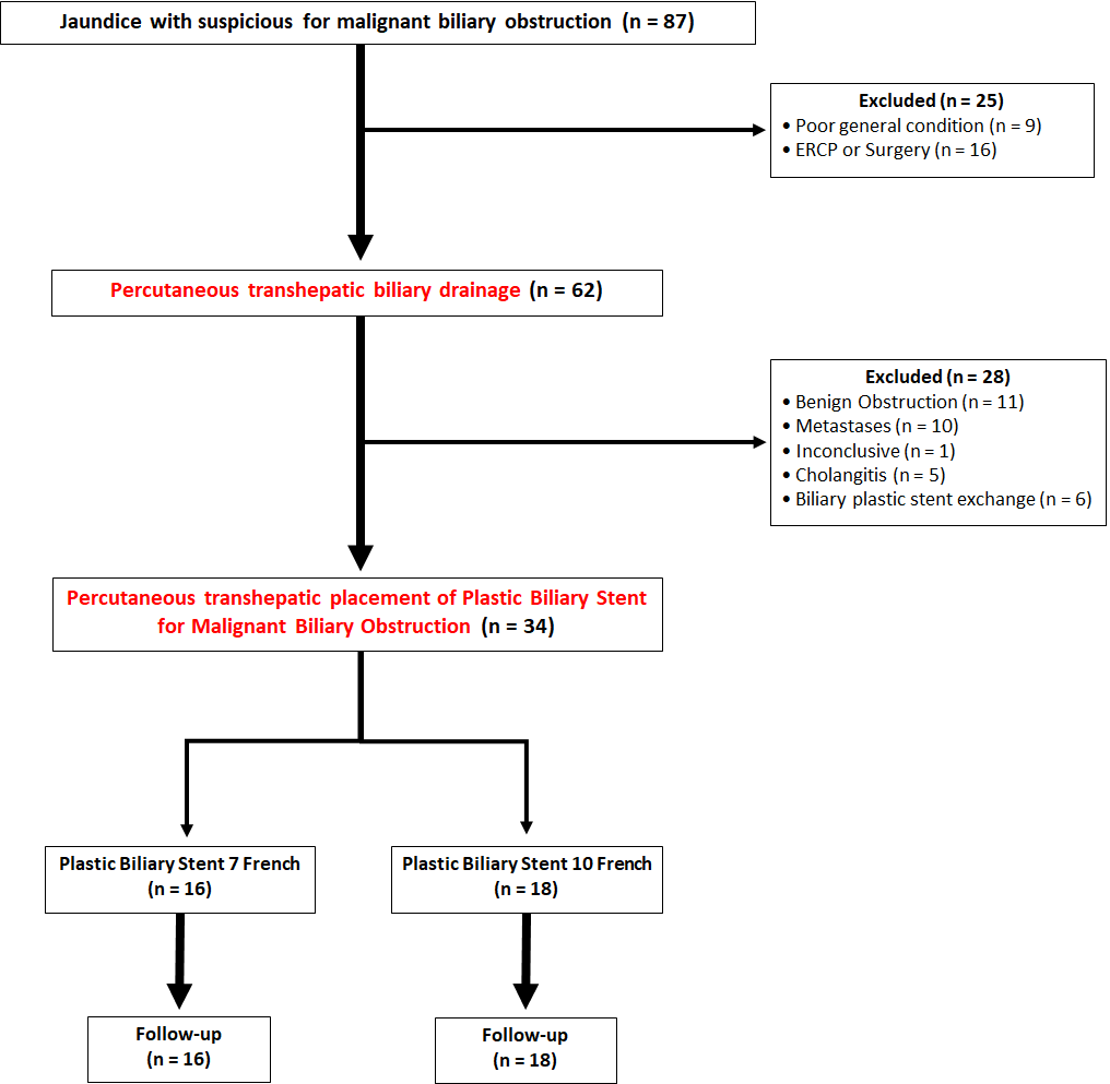 The main endpoint was to compare the primary patency of percutaneous transhepatic placement of two different sizes of PBS, 7 and 10F, for the treatment of malignant biliary obstruction. The secondary endpoints included technical success, clinical success, adverse events, and survival.