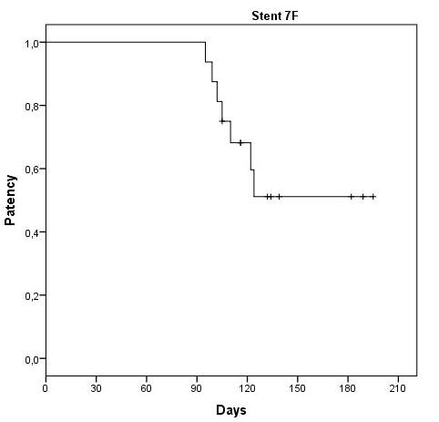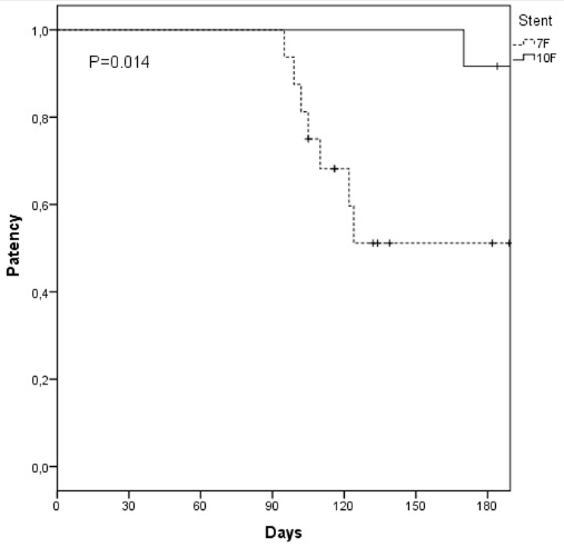 Our results demonstrated technical and clinical success in 100% of patients in both groups (7F versus 10F plastic prostheses). The primary patency was significantly higher in the group that used 10F PBS with 230.3days (95% confidence interval: from 214.0 to 246.7days) versus 153.2days (95% confidence interval: 130.5 to 175.9days) of the 7F prosthesis (P=0.014). In the 7F PBS group, the earliest dysfunction occurred 95days after the stent implantation, whereas in the 10F group, the earliest stent dysfunction occurred 170days after implantation, therefore almost twice as long. Around 170days after implantation, practically when all 7F stents were already occluded, 10F stents started to obstruct/occlude. We also note that the need to replace PBS with self-expandable metal stents (SEMS) was greater in the group that used 7F, 43% vs 25%, due to the greater number of obstructions. Another indication of the superiority, in terms of longer patency of 10F PBS over the 7F.