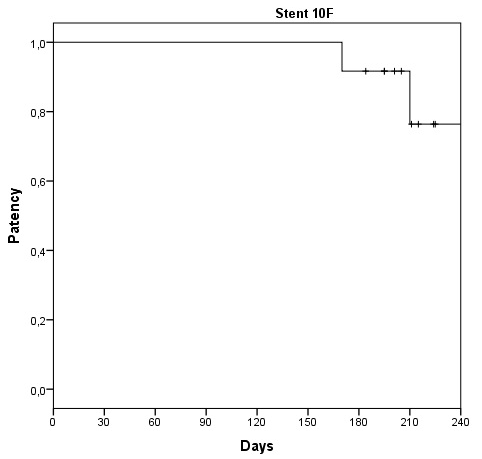 In the PBS 7F group, the earliest dysfunction occurred 95days after stent implantation, whereas in the 10F group, the earliest stent dysfunction occurred 170days after implantation, therefore almost twice as long.