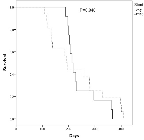 The median survival time in the group of patients who used the 7F prosthesis was 230.0 days (95% confidence interval: 176.7 to 283.0days) and the 10F prosthesis was 242.0days (95% confidence interval: 206.1 278.0days) with no statistically significant difference (P=0.840) (Figure 5). In the presence of a statistically significant difference between the two groups for total bilirubin 30-60days after PBS implantation, adjustments of patient survival comparisons for this factor were performed using Cox Regression. Comparing patients who used 7F PBS and 10F in regarding survival, there is still no significant difference after adjusting for total bilirubin after 30-60 days (P=0.236).