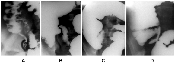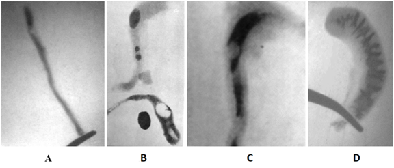 Figure 3 Radiographs of appendixes. (A). Radiograph of unchanged appendix uniformly filled with barium. (B).In two destructive AX are the radiocontrast (calcified) fecal stones. The parts of AX located distal to fecal stones are widened. In the lower AX, after opening the lumen two cavities, contrasted by air, are determined. Contrasting fecal stone lies next to the AX. (C).The oval X-ray-negative formation (fecal fragment) occludes the enlarged cavity at the apex of the AX. (D). Radiograph of destructive AX without foreign inclusions, but with an extended lumen filled coarsely modified mucosa.