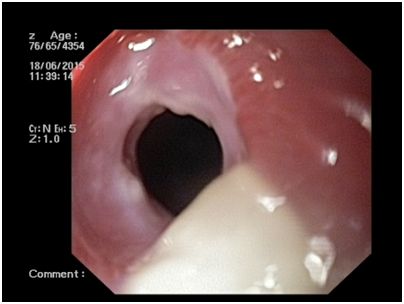 The investigations showed hemoglobin level of 8.7g/dl (microcytic hypochromic), total white blood cell of 13300 cells/cum and a platelet count of 5.1lakh/cumm. The work up for anemia revealed very low serum ferritin levels (4.72ng/ml), high total iron binding capacity and low transferin saturation, consistent with iron deficiency anemia. Stool routine examination showed ova of Ancylostoma duodenalis. Other biochemical parameters were within normal limits. The esophagogastroscopy showed a web in the cervical esophagus (Figure 3). The web was ruptured with the scope afterwhich, the endoscope could be passed to the distal esophagus. Stomach as well as first and second part of duodenum appeared normal except for pale mucosa. He was started on albendazole and oral iron therapy with elemental iron 6mg/kg daily. When reviewed after three months his general condition had improved and the repeat hemoglobin was 11.2g/dl.