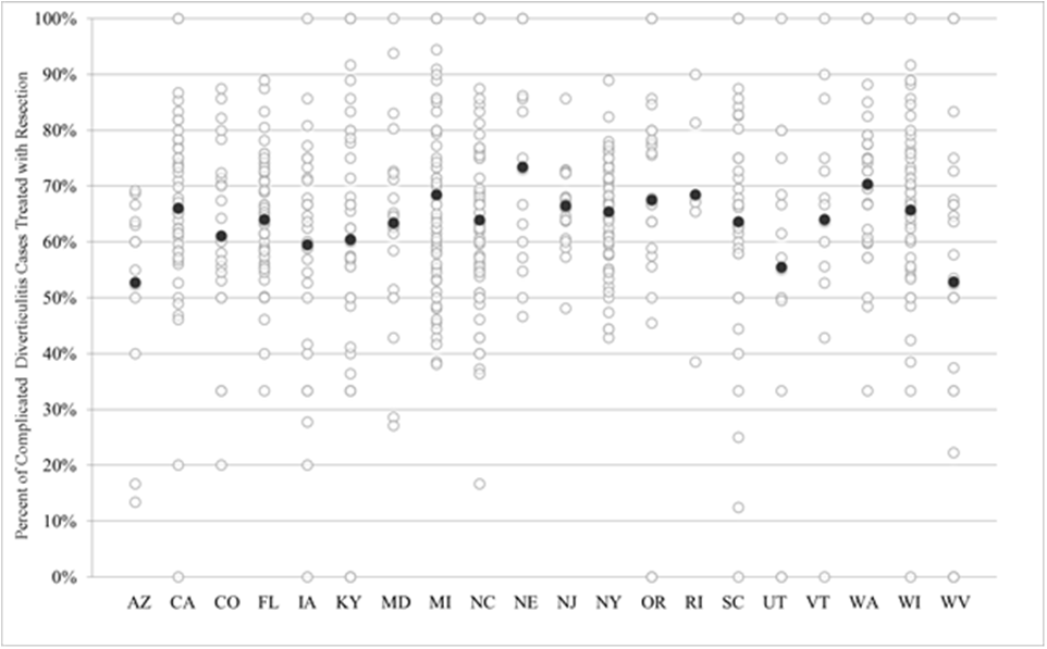 Geographic variation in resection rate for both complicated and uncomplicated diverticulitis is readily apparent. Describing the cause of this variation appears to be not a simple matter of disease burden, socioeconomic factors, or even healthcare provider availability. Rather, it is likely that a combination of factors determines the resection rate in a geographic region. While individual variation in disease presentation has stymied attempts to generalize a treatment protocol for acute diverticulitis, it is unclear that the more individualized approach advocated by some would be beneficial in the event that surgeon practice location directly affects resection rates.24,25 However, this logic contradicts the reasonable prevailing notion that individual variation in disease makes individualized treatment universally preferable. Better understanding of geographical differences in clinical judgments that lead to resection for diverticulitis could further elucidate the connection between surgeon distribution and resection rate.