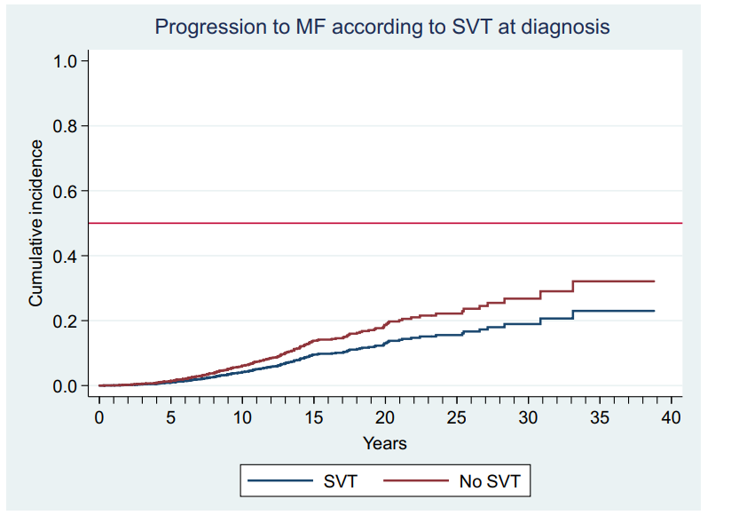 Figure 8 Estimated probability of progression to myelofibrosis (MF) adjusted by age and sex in polycythemia vera and essential thrombocythemia patients with splanchnic vein thrombosis (SVT) at diagnosis (blue line) or not (red line) p not significant.2