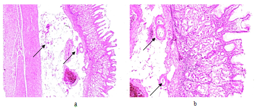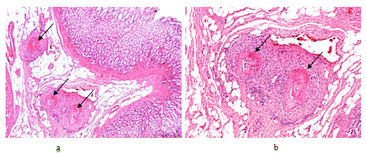 Small arteries, non-specific vasculitis with sectorial fibrinoid necrosis (arrows) in subacute-subchronic stage of inflammation.