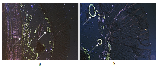 Same as Figure 3ab, Congo red staining, without alcoholic differentiation, covered with gum arabic. Viewed under polarized light (a) x50 (b) same as (a) x125