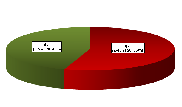 Figure 1.1 Prevalence of gastric n=11 (55.0%) and duodenal n=9 (45.0%) peptic ulcers in 234 RA patients.