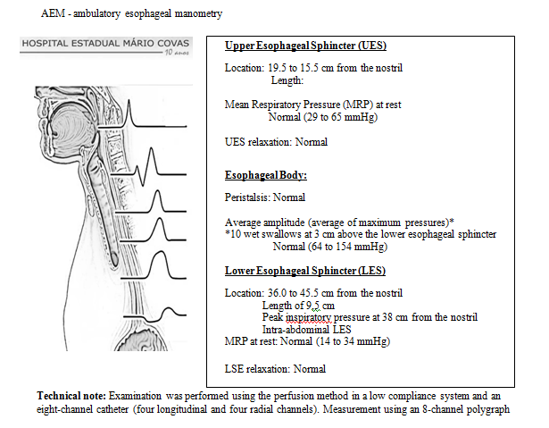 AEM: This examination was performed using a polygraph and an eight-channel silicone catheter (four radial and four longitudinal channels) in a perfusion system to identify the anatomical parameters necessary to guide the position of pH electrodes and assess esophageal motility changes. The physiological and pathological criteria of this examination were established by Nasi et al.7 (Figure 1).