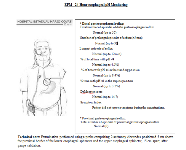 EPM: Monitoring was performed using catheters with one or two antimony electrodes to detect pH changes in acid reflux, according to the variation in H+ concentration in the distal esophagus. The physiological and pathological criteria used in this examination were established by DeMeester8 (Figure 2).