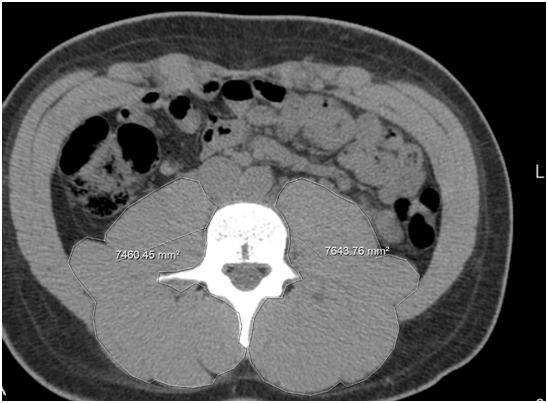 83 patients with NAFLD and 83 C were identified (Table 1). The composition of the groups was similar in terms of age, gender, and body mass index (BMI); the mean age of the patients in the NAFLD group was 48±12years, with 39 subjects (46.9%) being men versus the control group, in which the mean age of the subjects was 46±14years, and 42(50%) were men. The mean BMI was 30.3±5.6kg/m2 in the NAFLD group vs 30.6±6.6 in the control. Patients with NAFLD had a lower psoas and lumbar paraspinal muscle mass than those of patients in the control group (p<0.001) (Table 1). CT images of a patient with NAFLD and a control subject highlighting of lumbar paraspinal muscle areas are shown in Figures 1 and 2, respectively.