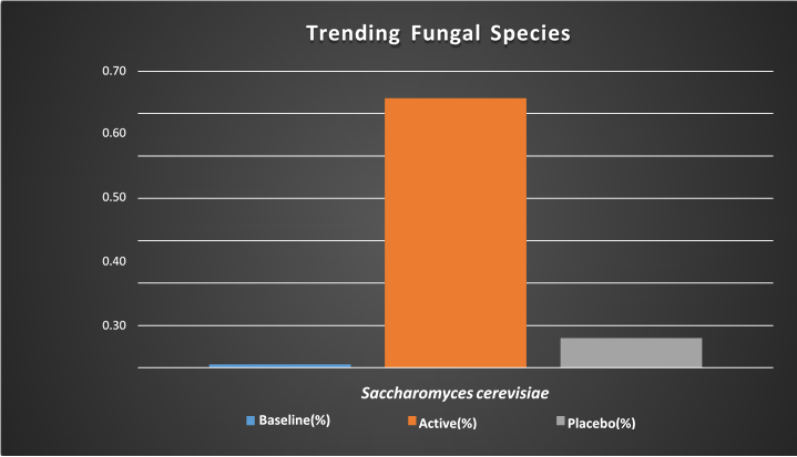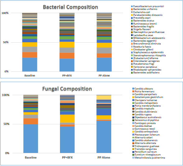 Bacteroides uniformis was highest in PP+BFX when compared to the baseline and PP alone, whereas the abundance of Saccharomyces cerevisiae was higher in PP+BFX compared with PP alone, as shown in Supplemental Figure 1. The mycobiome composition was more diverse in respects to the PP+BFX treatment with the key finding that Galactomyces geotrichum was significantly elevated when compared to baseline (P=0.046) (Table 4). G. geotrichum had a relative abundance of 4.1% at baseline and 12.1% in PP+BFX, demonstrating a 2.9-fold increase. Although not statistically significant, Candida albicans (39.7%) was decreased in the PP+BRF treatment compared to baseline (47.4%) or PP alone (49.8%) (Supplemental Figure 2).