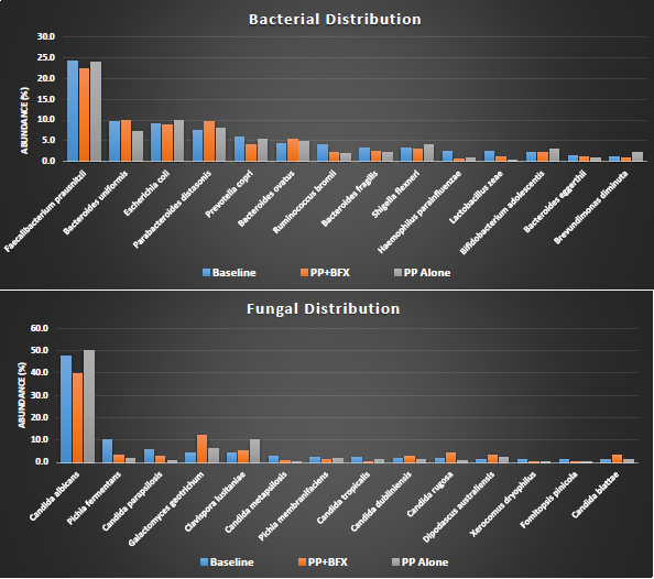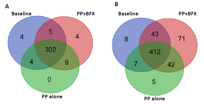 To determine the effect of supplementation with PP alone versus PP+ BFX on the microbiota profile, fecal samples were processed using our previously published methodology.18