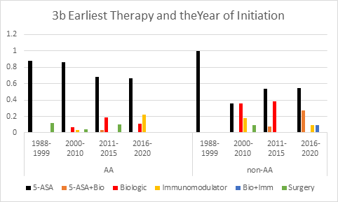 Interestingly, our data showed that aminosalicylates were more likely to be used as earliest therapy in African American patients compared to non-African American patients. The management of Crohn’s disease has changed tremendously over recent years, as newer and more efficacious therapies have been developed. Our data set regarding earliest therapy is more consistent with older therapies such as aminosalicylates. The racial disparity in early treatment of patients with Crohn’s disease was striking and driven by an increased ratio of 5-ASA use to biologics in AA as compared to non-AA. Somewhat unexpected was that this disparity with respect to earliest therapy was true regardless of when the therapy was initiated between 2012 and 2020. Racial disparity diminished in the patients with a visit post 2020 as they were shifted from 5-ASA to biologics. Yet to be evaluated is whether patients first seen in 2021-2024 receive biologics as first line therapy for their IBD.