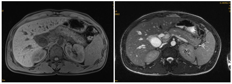 The biological assessment had objectified: a hemoglobin at 12.9g/L; number of leukocytes at 5230/mm3; 3260 neutrophils (62.3%); eosinophils: 230 (4.4%) (reference range: 40-500); total bilirubin 19.9mg/dL; alkaline phosphatase at 425U/L; gammaglutamyl transferase at 80U/L; ASAT at 225 U/L; ALAT at 376U/L. Lipaemia was at 122 (<3 times normal). Hepatitis serology and serum IgG 4 assay were negative. The abdominal ultrasound had shown a swollen pancreas in its cephalic portion with dilation of the intra- and extra hepatic bile ducts. The magnetic resonance cholangiography (BILI-MRI) had objectified a swollen aspect of the head of the pancreas which arrives in contact with the superior mesenteric vein without signal anomalies. It also showed significant dilation of the main bile duct and the intrahepatic bile ducts without vascular invasion and without dilation of the pancreatic ducts (Figure 1).