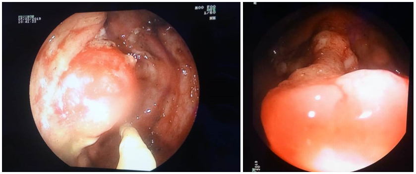 Given the symptomatology and the imaging data, a tumor of the head of the pancreas was the most likely diagnosis. Ultrasound endoscopy with biopsy made it possible to rule out maliginity and to make the diagnosis of pancreatitis with eosinophils. A colonoscopy done as part of the rectorragia had objectified a fragile rectal mucosa erythematous in one piece without interval of healthy mucosa from the anorectal line to the recto-sigmoid hinge. A sessile polypoid process was also found above the budding ileocecal valve, the site of ulceration at its apex (Figure 4). Multiple biopsies were performed. Histological analysis of the process did not show signs of malignancy. Whereas rectal biopsies showed an ulcerated epithelium resting on a chorion which sits of an inflammatory infiltrate with basal plasmocytosis with highlighted lesions of cryptites and cryptic abscesses.