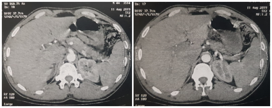 The management consisted of a corticosteroid full dose oral with degression as an initial treatment and local mesalazine as a maintenance treatment for ulcerative colitis. The evolution was marked by the remission of jaundice and rectal bleeding. An abdominal control scan done two months later did not show any abnormalities in the pancreas (Figure 5). A total colonoscopy of control showed a recto-colic mucosa without anomalies.