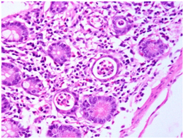 On clinical examination, patient was a febrile with normal vital parameters. The abdomen was distended; free fluid was present and gurgling was noted in left iliac fossa. Per rectal examination was normal. Her initial blood investigations including complete blood count, serum electrolytes and liver function tests were normal. X ray abdomen showed dilated small bowel loops. Chest X-ray was normal. Computed tomography scan of the abdomen showed features suggestive of sclerosing encapsulating peritonitis with subacute small bowel obstruction and a right adnexal mass (Figure 1). Ascitic fluid analysis: protein 5 g/ dL, albumin 2.3 gm/dL, total count 1200 cells/cu mm with 35 % neutrophils and 65 % eosinophils and normal adenosine deaminase levels. Upper endoscopy and colonoscopy were normal. Biopsy from the duodenum and terminal ileum did not reveal any abnormality, Mantoux test (45x25 mm) was positive. She was taken up for an emergency laparotomy.Intra-abdominal cocoon was noted andon opening the encapsulated cocoon, small intestine of approximate 30 cms length showed multiple (atleast six strictures) which was rescted (Figure 2). Histology of the cocoon capsule showedacute ulceration, fibrinoid exudate and haemorrhage with no evidence of granuloma or malignancy.The intestinal specimen showed hypertrophied muscularis propria, an edematous submucosa with mucosa showing 40 - 50 eosinophils / HPF. Subserosal region also showed dense eosinophilis (>100 eosinophils / HPF). No eosinophils were seen in the submucosa and muscularis propria. There was no evidence of granuloma, caseous necrosis, parasitic infection or vasculitis (Figure 3). Post operative period was uneventful and patient was given a short course of steroids that was tapered within 12 weeks. At present patient is asymptomatic.