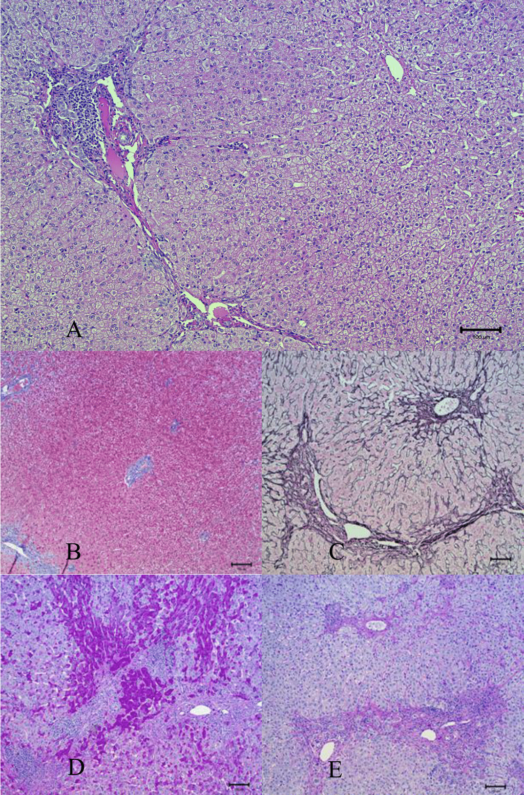 Figure 1 Liver biopsy. A) Mild, mixed chronic inflammatory infiltrate consisting of predominantly lymphocytes, rare eosinophils and plasma cells. B) The trichrome stain is negative for fibrosis. C) The reticulin stain shows an intact sinusoidal mesh work. D) Periodic Acid Schiff (PAS) stain highlights glycogen within the hepatocytes and no evidence of steatosis. E) The PAS with diastase stain is negative for large intracytoplasmic globules. All images taken at 100x magnification. Electron micrography images are not available.