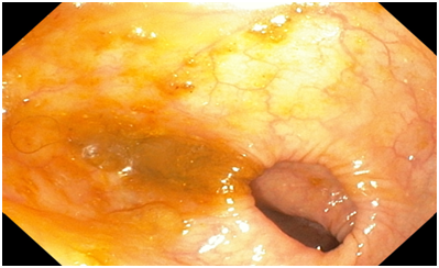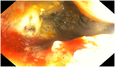 Colonoscopy. The colonoscope was passed all the way down to the ascending colon (distal part). The ascending colon contained circumferential fungating necrotic mass lesion extending all the way down to the caecum. The mass was friable, bled easily both spontaneously and with contact. Multiple biopsy samples were taken from the mass. There was some degree of luminal narrowing as well. The rest of the examined colon all appeared normal. No diverticulum or polyp seen. No observable synchronous tumour seen. Endoscopic Diagnosis was Right-sided colonic adenocarcinoma.