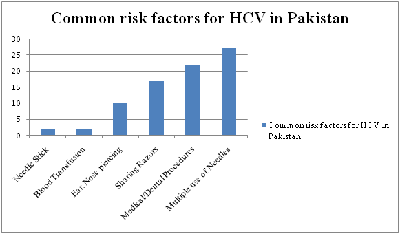 But this is not the case in Pakistan. Several studies have shown that multiple and unnecessary use of injections, unsafe medical/surgical procedures, use of contaminated razors by barbers, ear, nose piercing, blood transfusions and needle stick injuries (NSI) are major risk factors for HCV infection in Pakistan.29 Following Figure 3 shows the prevalence of HCV infection in Pakistan due to different risk factors ranging from 27% because of multiple use of needles to 2% due to needle stick injuries [29].
