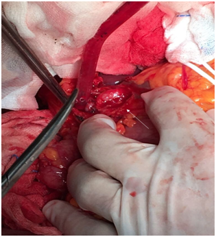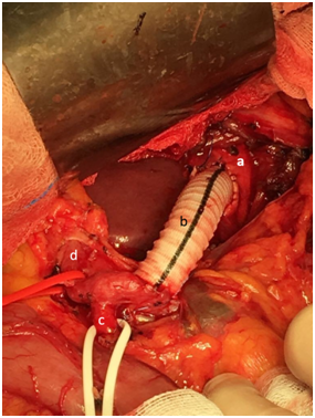 In multidisciplinary assessment, our hepato-bilio-pancreatic radiologist highlighted a periampullar resectable tumor and a celiac axis significant stenosis. Diagnostic angiography was then performed, which confirmed the celiac axis stenosis and revascularization was attempted, but proven to be technically infeasible. Surgical resection was decided. Intraoperative hepatic artery flow was severely compromised with GDA occlusion, confirming the celiac axis stenosis. A supra-celiac-aorto-hepatic bypass graft (uni-graft K-DV 8mm) followed by a cephalic duodenopancreatectomy with a dunking pancreato-jejunostomy, end-to-side hepatico-jejunostomy and piloro-jejunostomy was performed (Figures 3 & 4).