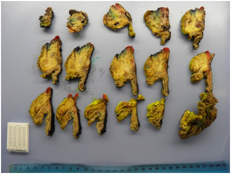 The postoperative period was complicated by a type a pancreatic fistula. Patient was discharged from the Intensive Care Unit (ICU) on the third postoperative day and from the surgical ward on the eleventh. Surgical pathology analysis showed an adenocarcinoma pT3N1 with perineural and lymphovascular invasion. Surgical resection margins were clear, except for neoplastic tissue found in <1mm of the posterior margin (positive lymph node with extra-capsular involvement) – R1 according to the AJCC 7th Edition (Figures 5 & 6).9