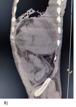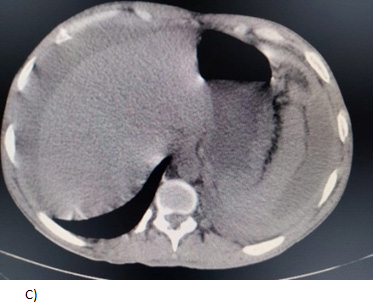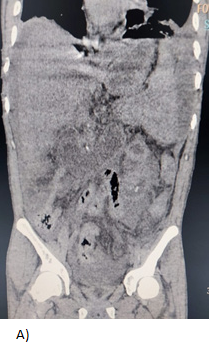 A 27-year-old male with a history of multiple hospitalizations and transfusions for dengue hemorrhagic fever, HIV (+) seven years ago with self-suspended treatment five months ago. He went to the emergency room due to abdominal pain in the epigastrium of three weeks' evolution accompanied by hyporexia, asthenia, and adynamia with hematochezia on one occasion, vomiting coffee grounds on one occasion with respiratory difficulty and dyspnea, denying fever or cough. Physical examination revealed moderate dehydration, pale integuments, tachypnea, and wheezing in the left hemithorax with wheezing in the right hemithorax, abdomen with signs of peritoneal irritation, vital signs: BP 100/60 mmHg, HR 154/min, Breaths 28/min, temp. 36.8 °C. Diagnosis of probable community-acquired pneumonia plus upper gastrointestinal bleeding, severe dehydration and HIV, hypovolemic shock, and septic shock are included. Laboratories: hemoglobin 5.5g/dL, leukocytosis (31000/103/L, absolute neutrophils 28 302/103L, lactic acidosis (PCO2 20.300 mmHg, PO2 73.40mmHg, HCO3 11.50mEq/L and lactate 12.60mmol/L). Tomography with data of honeycombing in both lungs to rule out PTB vs. PCP (Pulmonar tuberculosis vs. Probable Candida parapsilosis), left pleural effusion, bilateral atelectasis, and free peritoneal fluid with suspicion of probable gastric perforation. A CT scan is performed without specifying the origin of the septic shock (Figure 1 & 2). The patient is admitted to the operating room for exploratory laparotomy, purulent fluid (2500ml) is aspirated, a splenic abscess is identified on the diaphragmatic side and splenectomy is performed with the standard technique, admission to the Register Intensive Care Unit, later to the general surgery floor with an in-hospital stay of 9days, he is discharged with control by internal medicine, surgery and SAIH (Hospital Comprehensive Care Services).