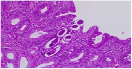 Figure 3 Histopathological examination of duodenal ulcers with chronic duodenitis, eggs end some adult forms of Strongyloides stercoralis, focis of ulceration and fibrino-leukocyte crust, without signs of malignancy - HE-200x.
