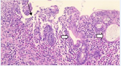 Figure 4 Colonic mucosa with microabscesses of crypts (black arrow) and architectural glandular distortion (white arrow) - HE-200x.