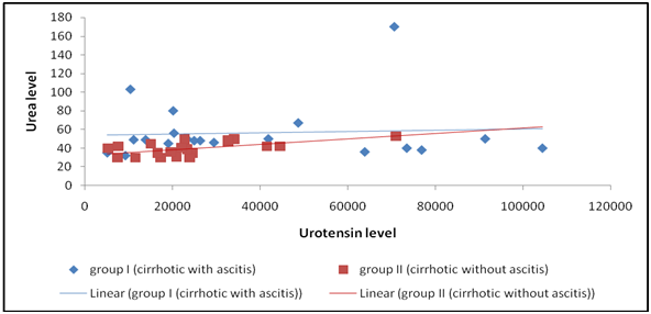 Results: There was no statistically significant difference as regard CBC parameters ( p>0.05) between the ascitic group (1) and non ascitic group (2), except for platelet count, there was a statistically significant decrease between the 2 groups (p<0.05). There was a statistically significant increase between the two groups as regard (ALT,T.B,DB and serum urea), P value <0.05,but no statistically significant difference as regards to total protein, serum albumin, alkaline phosphatase and serum creatinine (P value >0.05). The Ultrasound findings of the kidney's were of statistically significant difference between the two groups as regard nephropathy (8 patients in ascitic group 1 while one patient in non ascitic group 2) (p value <0.05). There was a statistically significant correlation between Urotensin II and blood urea level in group 2, but there was not with other variables. The cut‒off value of Urotensin II was of sensitivity 66.7%, specificity 64.5%, PPV 35.3% and NPP 86.96% with Accuracy 59% and p value <0.42 of no statistically significant difference.