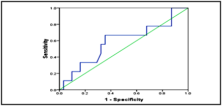 Table 7 shows the cut off value of urotensin II with sensitivity, specificity, PPV, NPV, Accuracy and 95% CI of AUC with no statistical significant (P value 0.42). Figure 1 shows positive correlation between the Urotensin II and blood urea (P value, 0.016). Figure 2 ROC curve shows that Urotensin II level was non significant diagnostic test for hepatorenal syndrome (AUC was 0.59 & P value was >0.05).