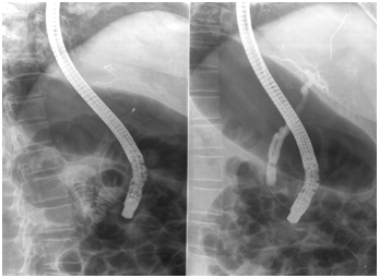 Two cases report pleural involvement, whose pathogenesis should be depended presumably from the inflammatory reaction resulting by the anatomical relationships between the pleural and the walls of the hematoma. In Almost all cases endoscopic procedures were performed by using a wire guide; howewer the type of wire guide is not specified. Bleeding disorders or special medical conditions or liver disease at risk for bleeding were not described. In nineteen cases the management of hematoma was conservative with a medical therapy with antibiotic and fluid infusion while in thirteen cases a percutaneous drainage was performed. Embolization is recorded in five cases. Surgical treatments were performed in eleven cases. There were recovery in forty-three patients; three patients deceaded. The pathogenesis of subcapsular hepatic hematoma is not clear. It is most likely due to the trauma of the tip of the guidewire resulting in puncture of liver parenchyma with rupture of small blood vessels, when it is pushed-on in the intrahepatic biliary tree in association with injection pressure of contrast medium. This might explain both the presence of air in the hematoma and the high frequency of bacterial contamination with the risk of abscess formation, as the procedure was performed under not sterile conditions. The endoscopic maneuvers with the guide wire should be conducted with caution and avoid to push the guide wire in the bile ducts higher than necessary, in not dilated biliary tree especially (Figure 1). By keeping in mind this complication, the careful management of the guide by endoscopist or his/her assistant is essential for avoiding its eccessive manipulation and the loss of the edge of the fluoroscopic distal image. The management of the complication depends to the size of hematoma, the patient's hemodynamic stability, the anemia degree, the presence of infection and the patient's general conditions. Its conservative management is usually effective if identified and treated rapidly with a multidisclinary approach of medical or interventional radiology and surgical input.17–59