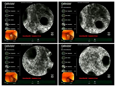 Figure 2 Confocal laser Endo microscopy showing complete disorganization and loss of glandular architecture with diffuse inflammatory cell infiltration.