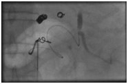 Due to failure of the medical and endoscopic treatment to control bleeding, the patient was again tachycardic with hypotension (HR:98/min, BP:90/55mmHg), a percutaneous transhepatic approach was decided as he was unsuitable for TIPS due to cardiac co-morbidities. During selective venography, the splenic vein was found totally occluded and multiple ectopic fundal varices (collaterals) were identified. An emergency percutaneous transhepatic variceal embolization (PTVE) of the patient’s ectopic veins with coils was performed without serious side effects. One week after the ectopic varices embolization the patient had a repeated episode of hematemesis with hemodynamic destabilization (BP:80/45mmHg, HR:105/min). A Sengstaken-Blakemore tube was inserted and a repeat endoscopy revealed multiple fundic varices with cherry red spots, an ulcer on a varix surface and blood clots in the stomach. Blood transfusion with 4 units of red blood cells was given.