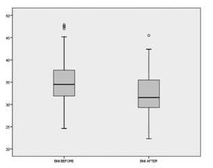 A first and second balloon was ingested successfully by 74 subjects. The mean time for ingestion procedures (swallowing of the capsule and inflation of the balloon) was 9min (range: 5-22min). All balloons were removed by upper GI endoscopy, under conscious sedation without tracheal intubation. At the time of withdrawal, we found 2 subjects with 1 balloon deflated (these 2 subjects came for withdrawal after 4months, and the balloons were expelled through the stools). 10 gastric superficial erosion lesions were observed in 10 subjects, probably in relation with using NSAIDs and without proton pump inhibitor (PPI). The balloons were removed without any difficulty in all cases. Stomach pain/cramping was the most common adverse event occurring in 65 (87%) subjects, being treated with oral antispasmodic medical therapy, and 18 (24%) subjects reported Nausea, treated by oral domperidone. All reported adverse events (AEs) were mild to moderate at most. The number of AEs was similar with one and two balloons. No reported cases of removing balloons before 12weeks. This pilot study showed significant decrease of weight and body mass index at 12weeks, with high rate of successfully swallowing and transient side effects induced by up to two balloons (Figures 1-5).