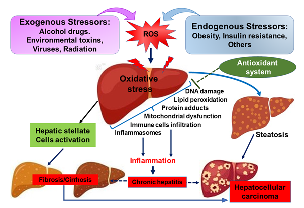 The diagnostic and prognostic factors for liver diseases primarily comprise the liver function tests (LFT) which are efficient screening tool that effectively detects hepatic dysfunctions.5. Bilirubin is a major hepatic marker produced by the lysis of red cells (the haem component) within the reticuloendothelial system. The unconjugated form of bilirubin is delivered to the liver and forms a water-insoluble complex with albumin that cannot be eliminated in urine. Conjugated bilirubin, on the other hand, is water soluble and is eliminated from the body through urine. Serum bilirubin levels are predominantly unconjugated, indicating a balance between production and hepatobiliary excretion. Bilirubin production increases as a result of hemolysis and poor erythropoiesis, and it is then used as a marker of liver function. Other important measures of liver function include aminotransferases, particularly aspartate aminotransferase (AST) and alanine aminotransaminase (ALT), which are excellent indicators of hepatocellular injury. They contribute to gluconeogenesis by catalysing the transfer of amino groups from aspartic acid or alanine to ketoglutaric acid, resulting in the formation of oxaloacetic acid and pyruvic acid. Alkaline phosphatase (ALP) is the next key indicator of liver function, derived from the liver and the bone. ALP increases can be ranged from moderate to severe in the extrahepatic biliary obstruction, hepato-infiltrative disorders, and liver inflammation and cancer conditions. Glutamyl transferase (GGT) mainly found in hepatocytes and biliary epithelial cells serves as a sensitive test marker for hepatobiliary diseases including HCC. Albumin synthesis is an important function of the liver which serves as the marker of liver dysfunction when serum albumin levels reduce.6 In patients with cirrhosis, albumin infusion reduces mortality in patients with spontaneous bacterial peritonitis and improves outcome following large volume paracentesis.7 Liver is a major organ attacked by the process of oxidative/nitrosative. oxidative stress induced by various factors including ROS, RNS, inducing irretrievable alteration of lipids, proteins and DNA contents, mitochondrial dysfunction, NADPH-requiring enzyme, the cytochrome P450 enzyme CYP2E1 on liver diseases. A cellular antioxidant function system is required to neutralize the influence of various hazardous cellular agents through the antioxidant system in order to preserve the imbalance of the antioxidant system induced by oxidative stress/nitrosative agent.8