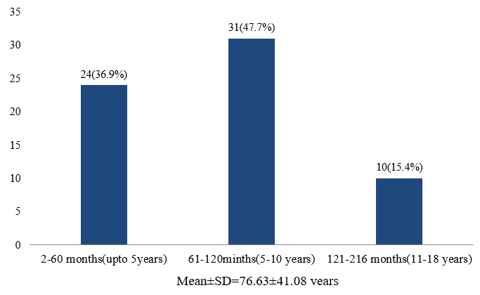 This observational cross-sectional study was conducted in the Department of Pediatric Respiratory Medicine, Bangladesh Shishu Hospital & Institute, Dhaka, Bangladesh. After careful history taking, examination and appropriate investigations, a total of 65 children visited the out-patient department, fulfilling inclusion and exclusion criteria, were included in this study. The mean age of all patients was 76.63±41.08 months (2-216 months) with majority belonged to 61-120 months of age (47.7%). About 45(69.2%) respondents were male and 20(30.8%) were female (Figure 1& 2).