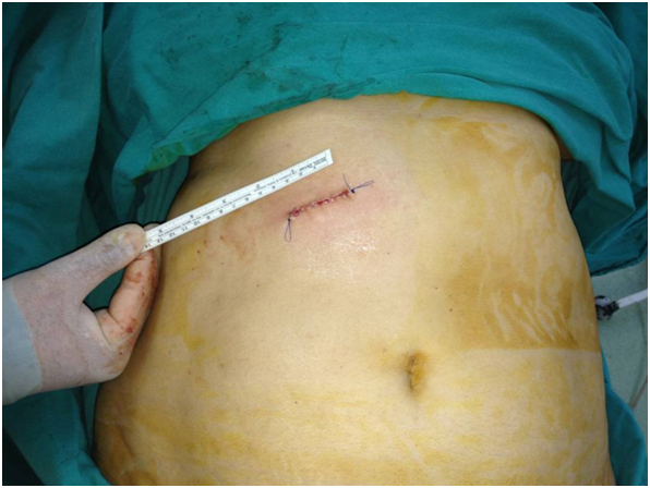 After approval by the Ethical Committee of the Sakarya University, all patients who underwent cholecystectomy by a single surgeon due to symptomatic cholelithiasis or acute cholecystitis were retrospectively analyzed. Patients were categorized in to three groups whether they underwent LC, OC or MC. Standard LC was done by using four-trocar technique. OC was performed through a 6 to 8 cm subcostal incision. For the MC procedure, the skin incision was ≤6 cm (Figure 1).
