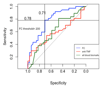 Results: One hundred and eighty patients were included. Faecal calprotectin was better at distinguishing between quiescent and active endoscopic disease than anti-TNF level .AUC 0.78 (95% CI 0.68 – 0.89) versus 0.62 (95% CI 0.48 – 0.75). Faecal calprotectin had a higher sensitivity (77% vs 50%) and specificity (71% vs 64%) compared to anti TNF levels in predicting endoscopic activity. We found that a faecal calprotectin threshold of 200ug/g and similarly an anti TNF level of 6.21ug/ml optimally predicts endoscopic disease. Using linear discriminant analysis, faecal calprotectin was weighted against C-reactive protein (CRP), albumin, platelet count, anti-TNF, and has shown to be better at predicting mild to moderate disease activity (Log FC=0.74).