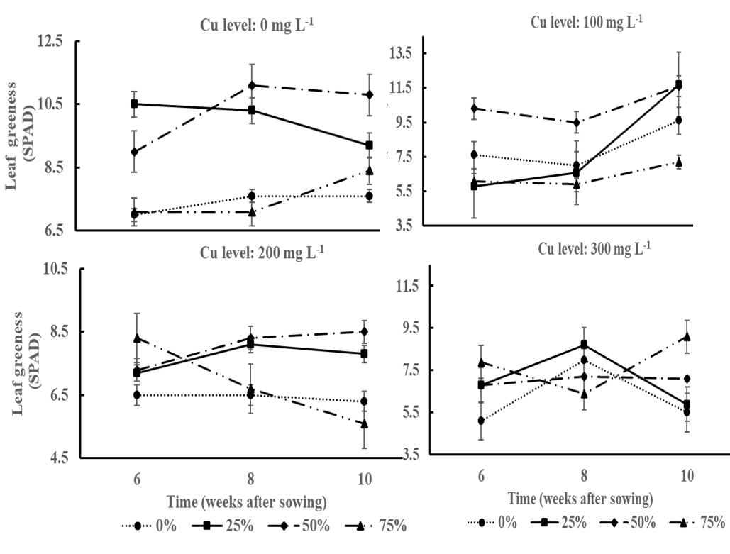 The results indicated that the addition of low to moderate vermicompost to a medium containing 100 mg Cu l-1will enhance leaf greenness. The benefits of supplying adequate Cu to plants are attributed to its role in metabolic processes such as chlorophyll production.2 The vermicompost also contained Cu, which may have influenced the concentration of the added Cu. The anthocyanin content of leaves from carrot plants treated with 100 mg Cu l-1was higher than that for leaves from the control plants. However, the 200 and the 300 mg Cu l-1 had the least anthocyanin content suggesting that plant defense was lower due to Cu stress. Exposure to excess Cu results in the production of reactive oxygen scavenging activities and reduced plant physiological functions.2 The 50% vermicompost under 100 mg Cu l-1 had a slightly higher anthocyanin content compared to the control at week 10 (Figure 3). This result indicated that moderate vermicompost and low Cu additions had a greater effect on anthocyanin production, which is a plant protective mechanism under stress conditions. Overall, the results indicated that Cu equilibration and vermicompost rates are important regulators of chlorophyll activities and plant defense.